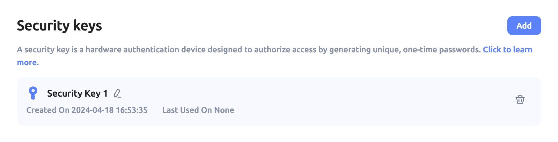您可以查看新增安全密钥的详情,包括其创建时间和最后使用时间。