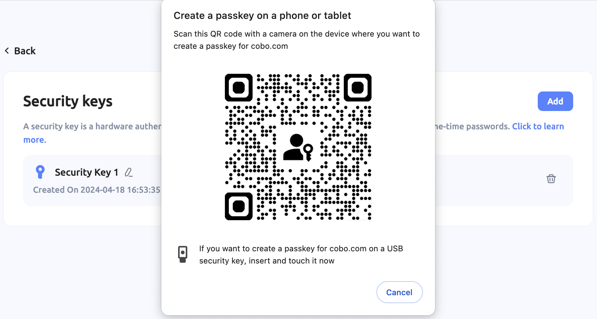 安全密钥是一种安全的物理设备,用于在 MFA 验证过程中辅助验证您的身份。您最多可以向您的 Cobo Accounts 添加 10 个安全密钥。
