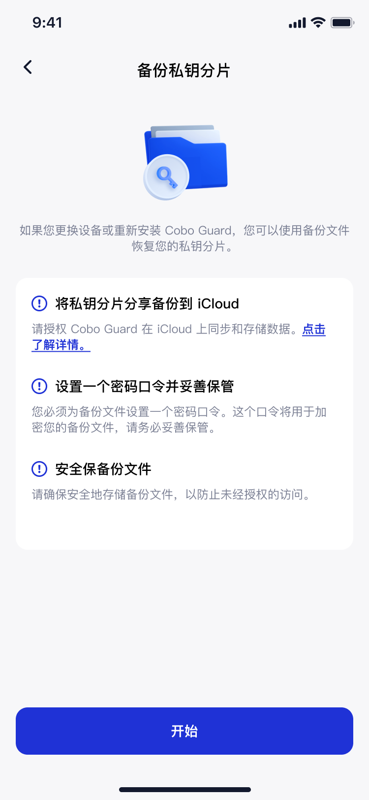 在备份私钥分片屏幕上,点击开始,然后使用 Face ID 进行身份验证。