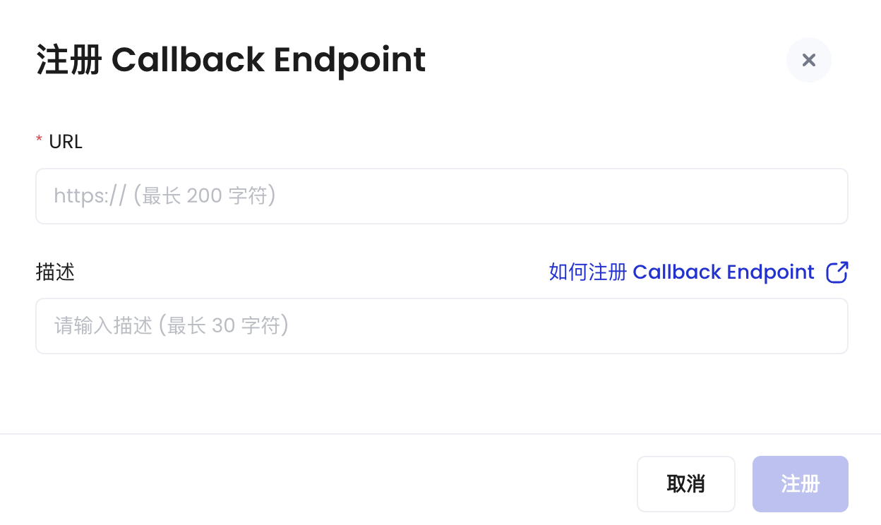 注册 Callback Endpoint 后,您可以在注册 API Key 时选中该 Endpoint,用于接收由该 API Key 触发的 Callback 消息。有关注册 API Key 的详细说明,请参阅注册 API Key。欢迎提交您的反馈,帮助我们持续优化文档质量!