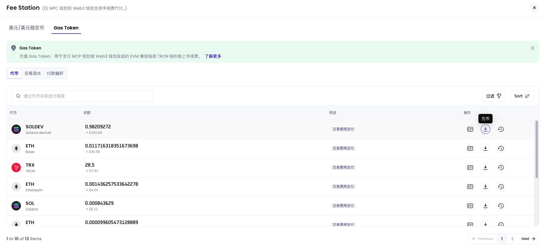 - 切换到Gas Token标签页,在列表中找到目标链对应的 Gas Token(例如 TRX、ETH、MATIC 等)。