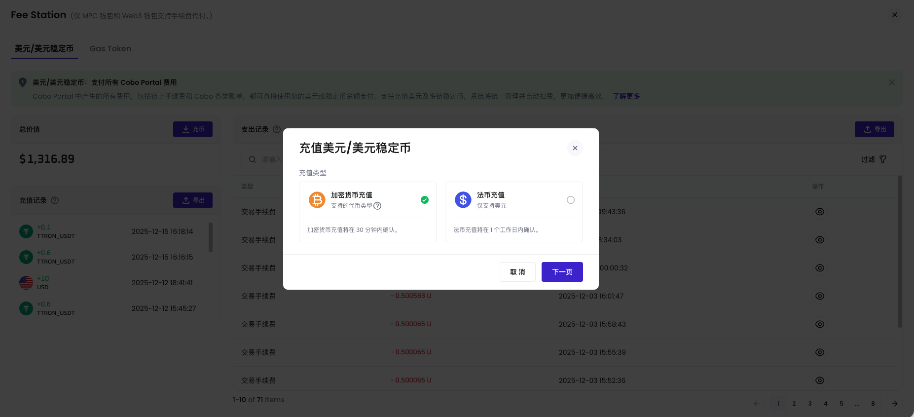 Fee Station 支持充值美元法币或美元稳定币。充值后,您可以在 Fee Station 中使用这些资金来支付交易手续费、平台服务费和托管费等账单。 在美元/美元稳定币标签页,您可以查看当前账户中余额,充值记录及其支出记录,并发起充值操作。Fee Station 支持的稳定币类型请参考支持充值的代币类型。- 登录 Cobo Portal。