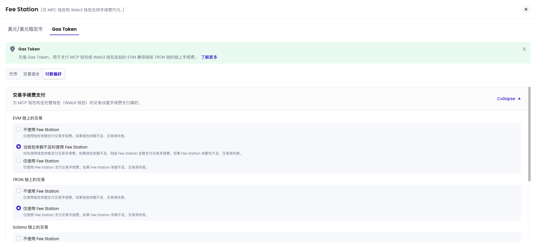 在 Gas Token > 付款偏好 标签页,您可以为 MPC 钱包和 Web3 钱包基于支持的链分别设置链上手续费代付策略。