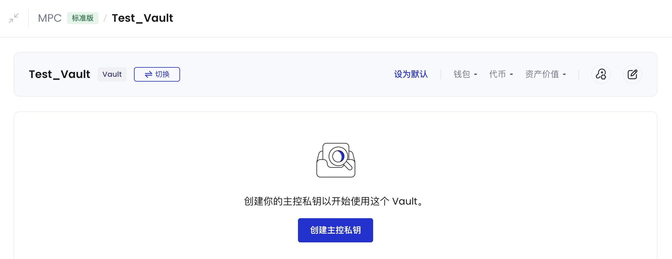 - 选择 Vault,然后点击 Vault 名称下的创建主控私钥。