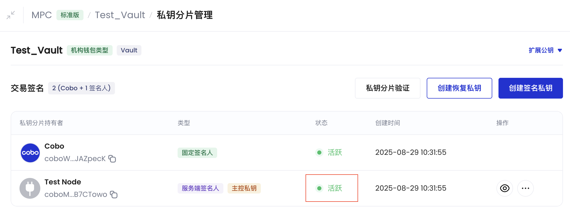 私钥分片生成过程于第 5 步完成后,主控私钥分片持有者的状态将显示为活跃。