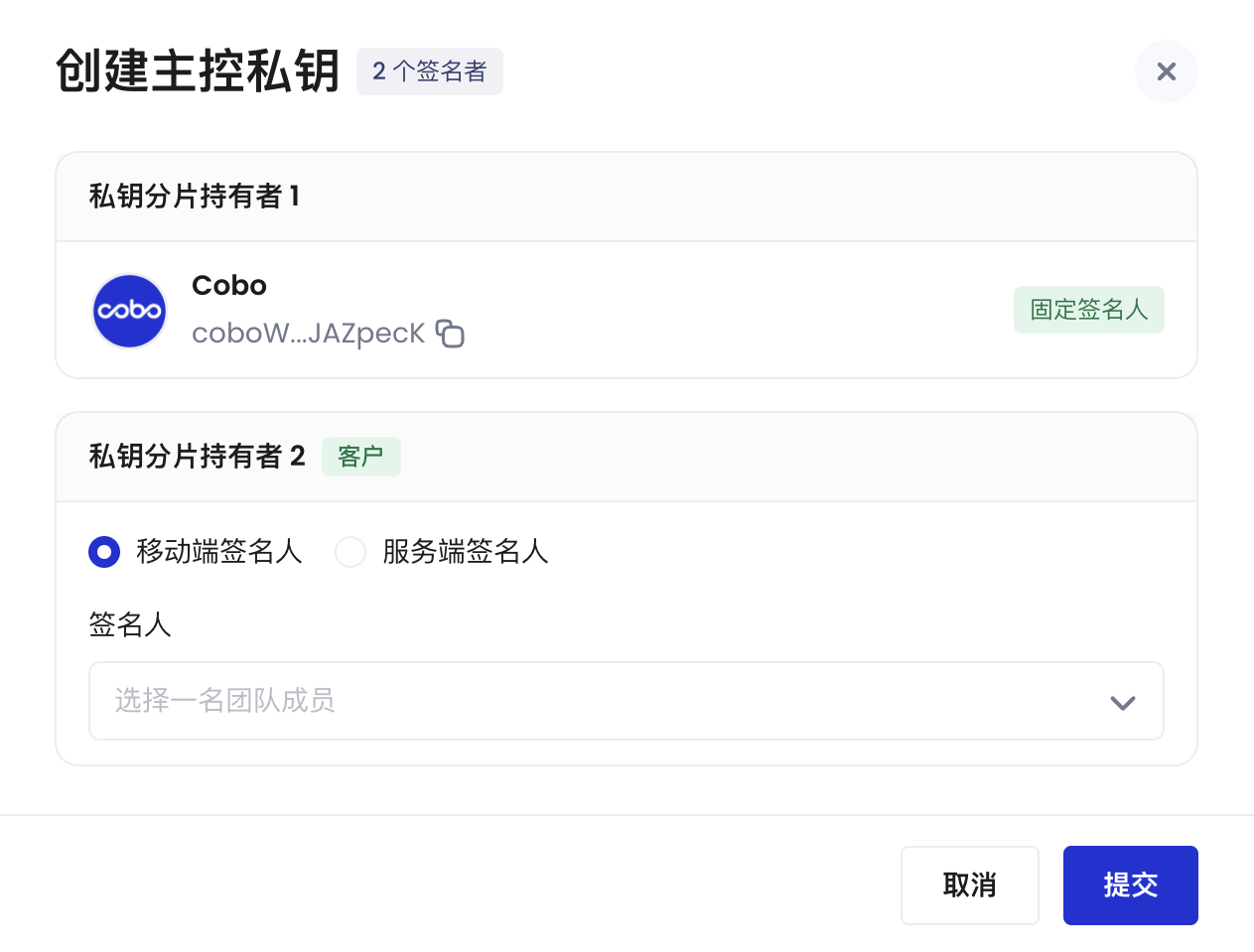 - 如果使用移动端签名人,选定的私钥分片持有者需要使用 Cobo Guard 生成私钥分片,详情参见生成私钥分片。