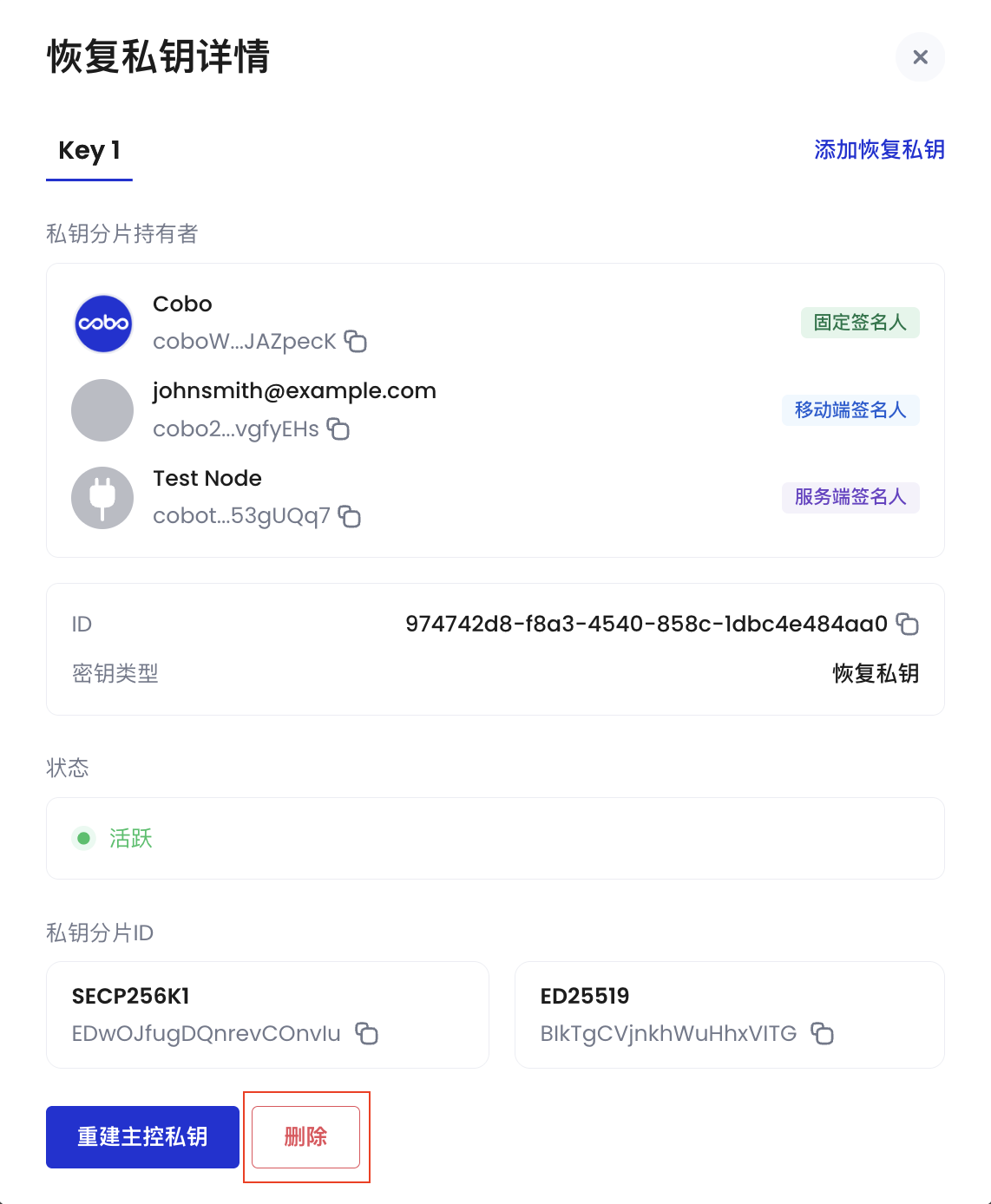 - 在私钥分片管理页面,点击恢复私钥,然后选择要删除的恢复私钥。