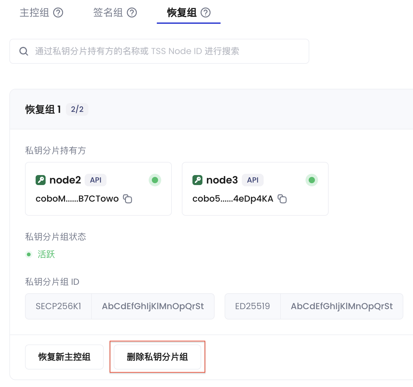 - 在私钥分片管理页面,点击恢复组,然后选择要删除的恢复组。
