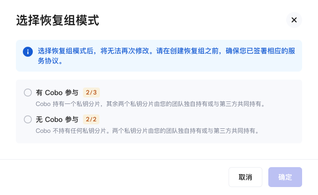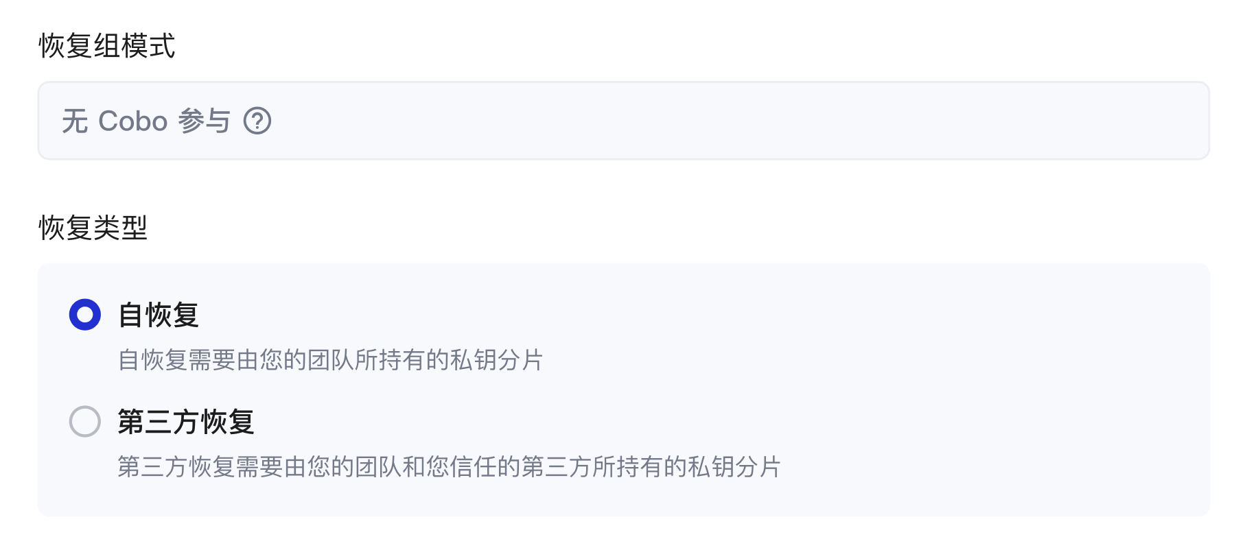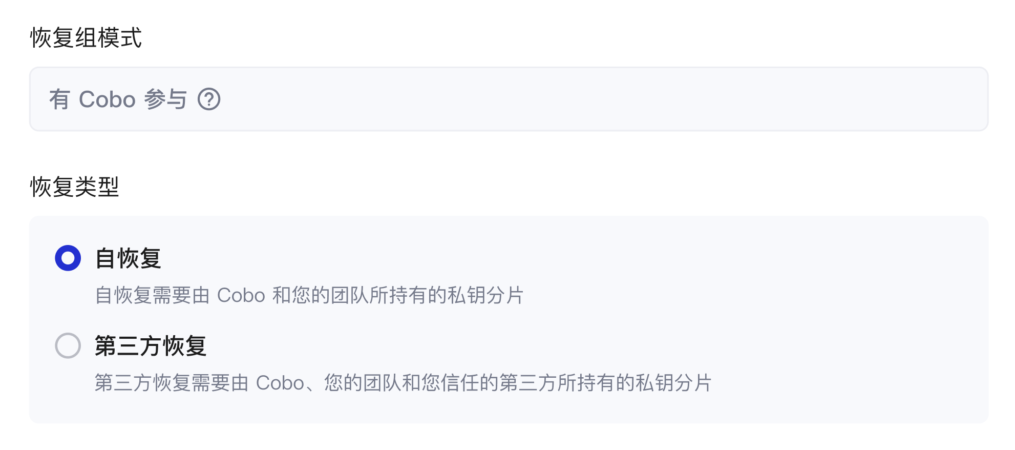 - 选择自恢复或第三方恢复。自恢复需要由 Cobo 和您的团队所持有的私钥分片,而第三方恢复需要由 Cobo、您的团队和您信任的第三方所持有的私钥分片。