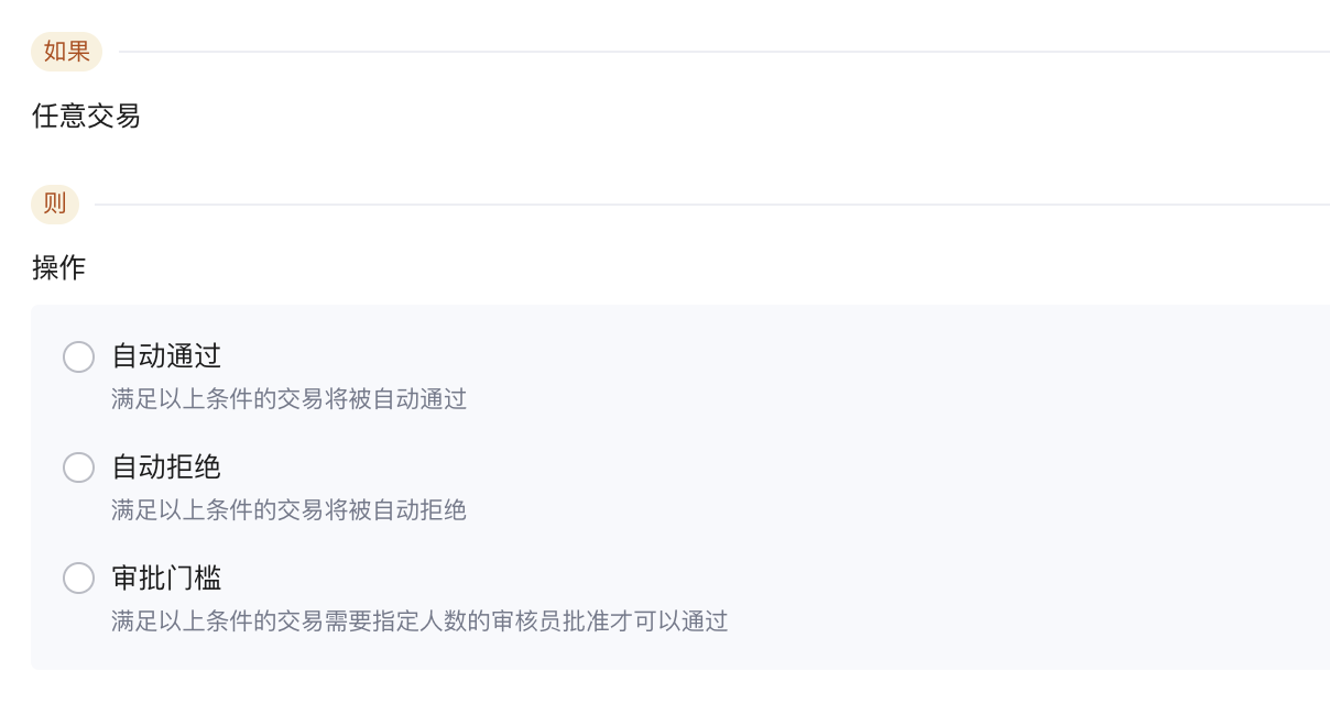 - 自动通过:自动批准交易,无需人工审核。