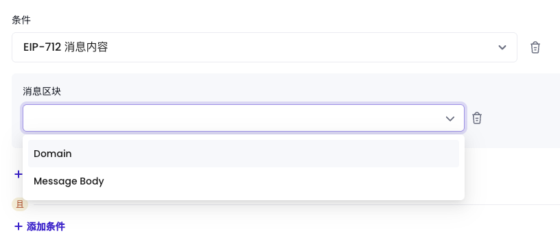 EIP-712 消息内容:只有当 EIP-712 签名请求匹配您配置的规则时,才会触发该风控规则。该条件支持对 EIP-712 请求中的 Domain 和 Message Body 进行更精细的检查,从而更好地控制签名风险。