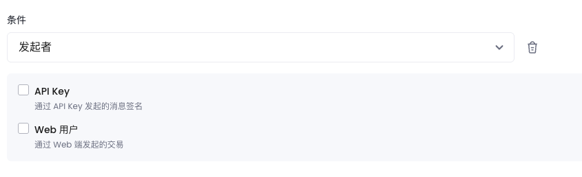 您可以在同一条规则内组合多个字段进行检查,匹配逻辑为 AND(且):只有当所有检查项均满足时,才会命中该风控规则。发起者:只有当发起者符合时,规则才会被触发。对于条件 Safe{Wallet} 消息签名,请参阅 Safe{Wallet} 消息签名风控。