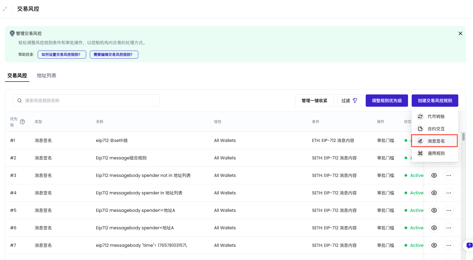 选择此风控适用的所有钱包。以下钱包类型支持消息签名风控: