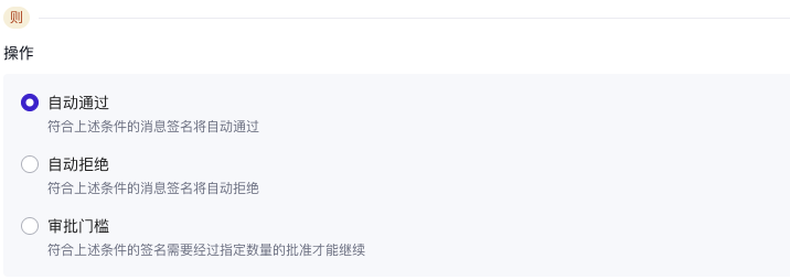 在则下,选择规则触发时要采取的操作(即自动通过、自动拒绝和审批门槛),然后点击下一页。