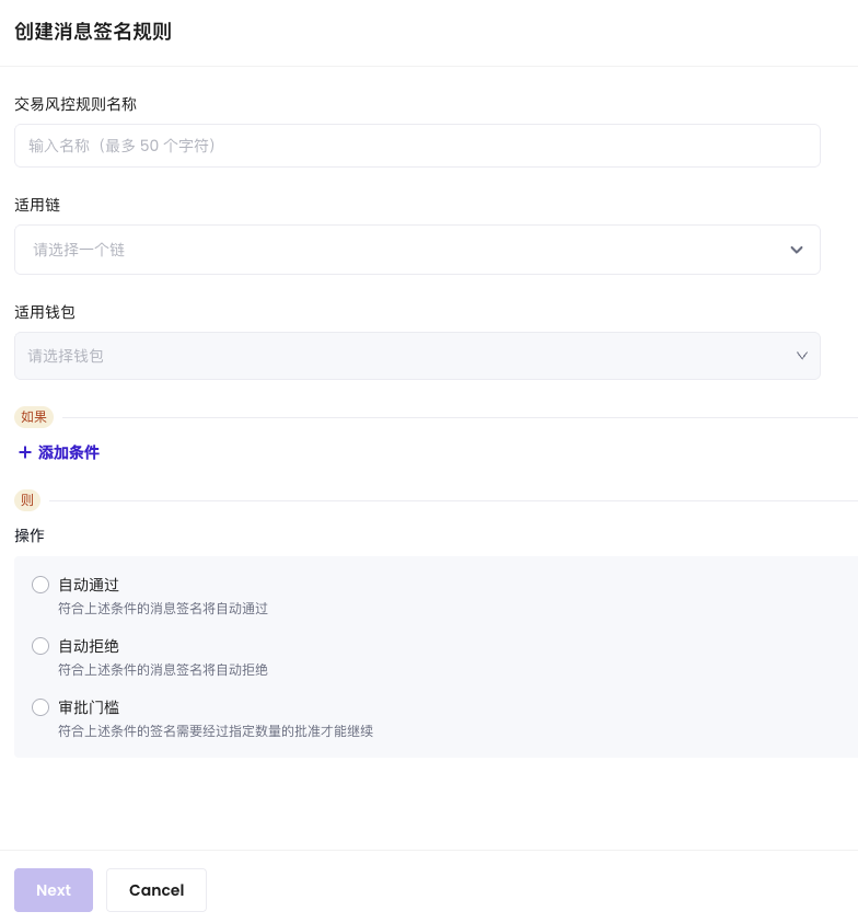 在创建消息签名规则页面,输入交易风控规则名称,名称不能超过30个字符。