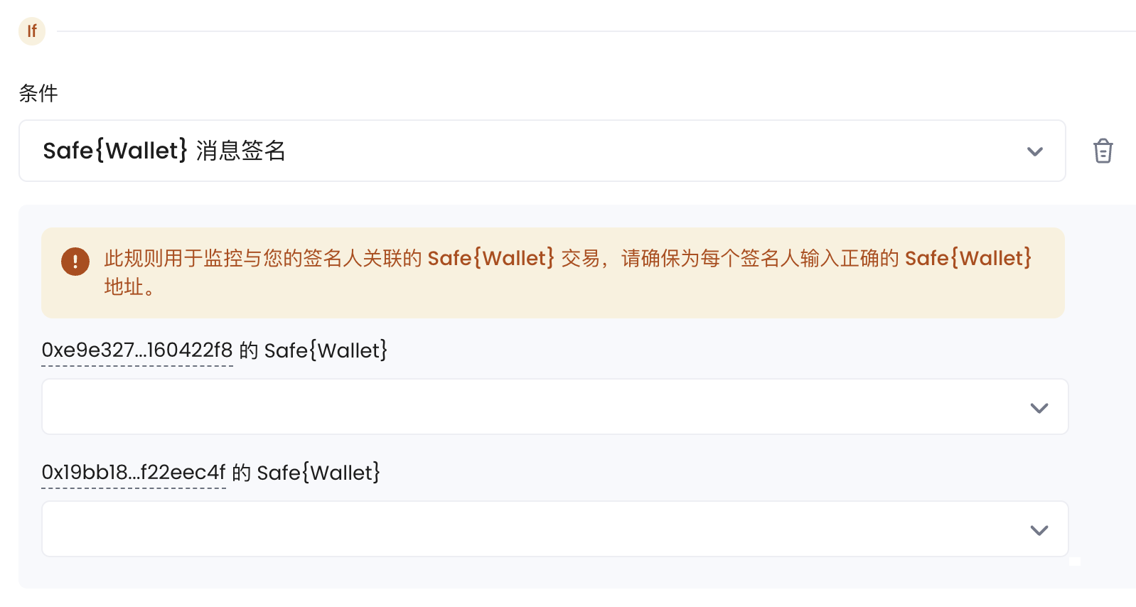 出于安全考虑,条件 Safe{Wallet} 消息签名不能与其他条件(如发起者和消息类型)组合使用,这确保您的 Safe{Wallet} 消息签名受专用规则保护。
