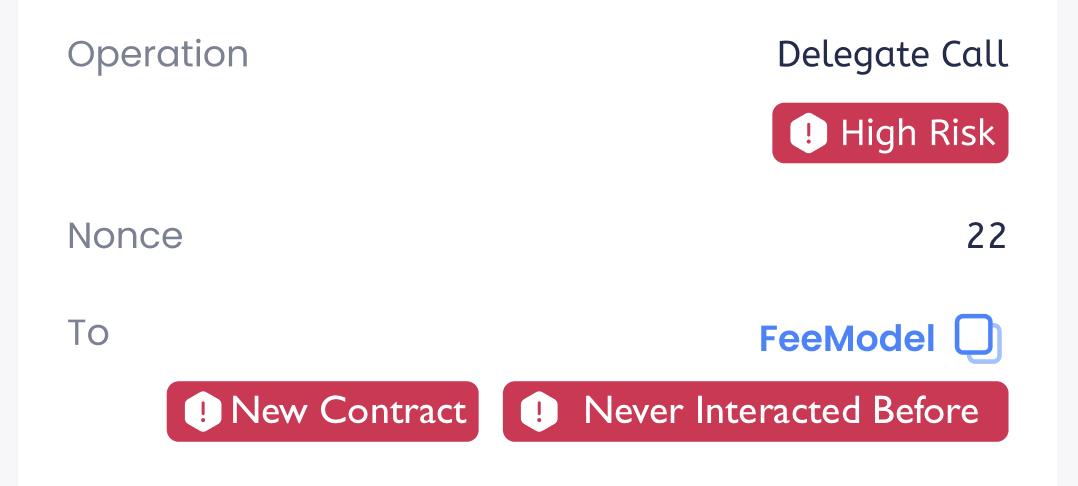 To 地址 交易类型 风险标签 说明 Safe{Wallet} 自身 合约交互 Wallet Config Change 钱包配置变更 非 Safe{Wallet} 自身 转账 Never Transacted Before 首次交互的接收地址 非 Safe{Wallet} 自身 合约交互 Never Interacted Before 首次交互的合约地址 非 Safe{Wallet} 自身 合约交互 New Contract 合约部署时间不足30天(720小时)
