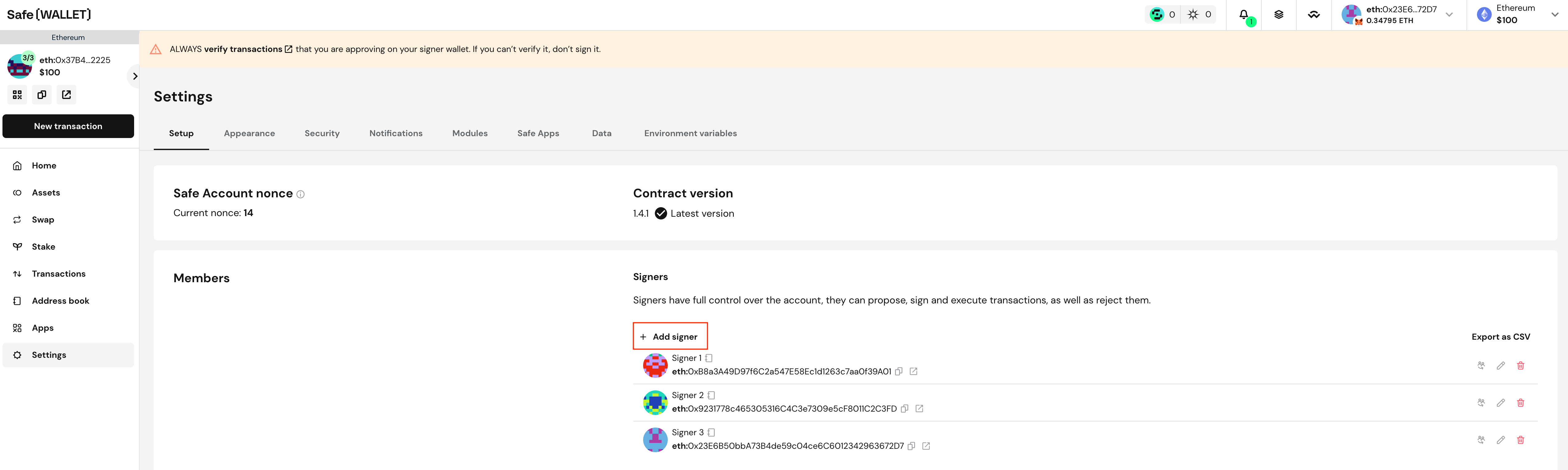 在您的 Safe{Wallet} 中,进入 Settings,找到 Members 部分。点击 + Add signer。