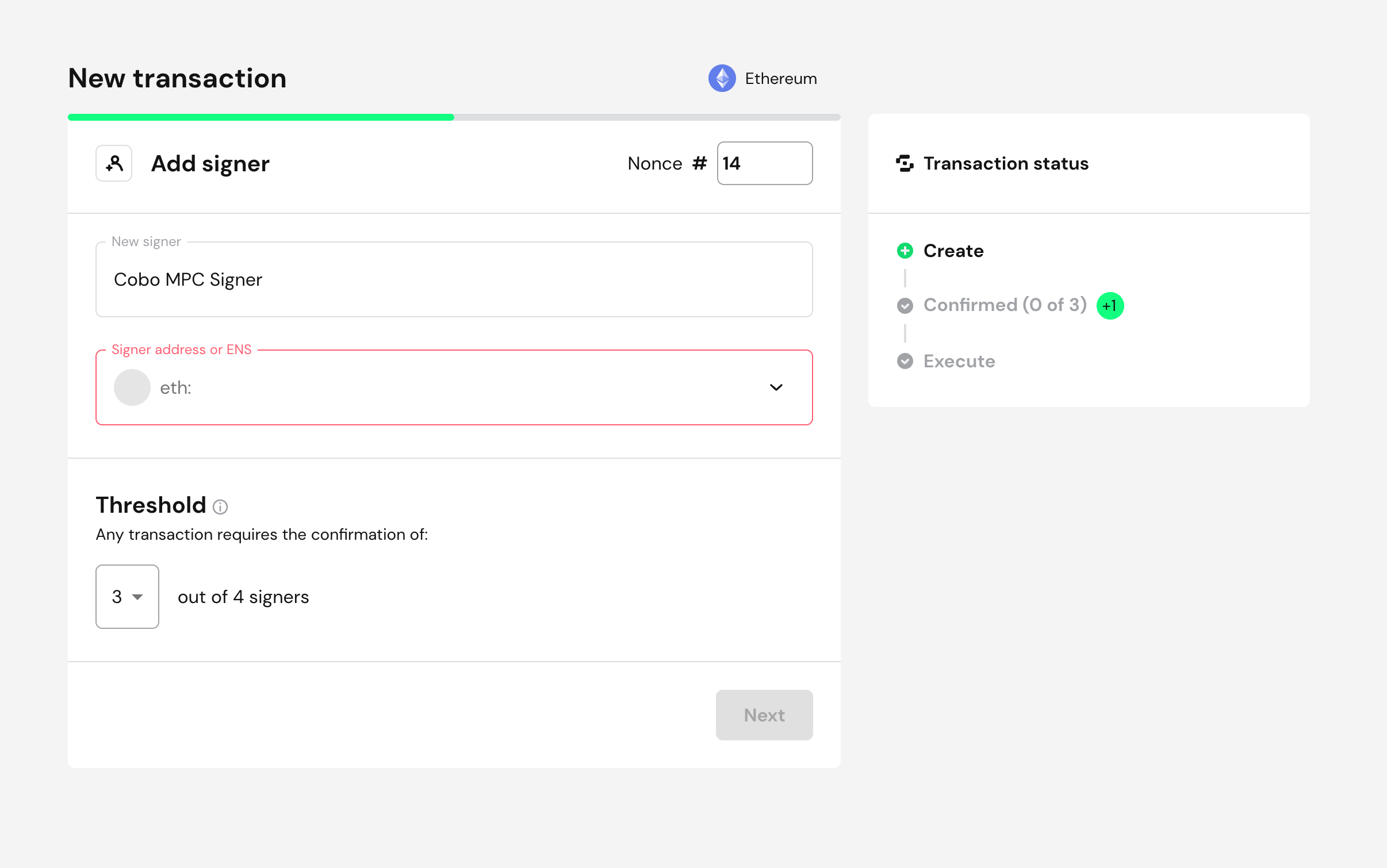 输入要作为签名人的 Cobo Portal 钱包地址,调整签名门槛(可选),然后点击 Next。