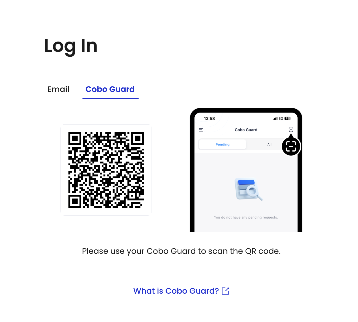 Cobo Guard is a transaction approval application developed by Cobo that allows you to authorize transactions anytime, anywhere, and securely store your MPC key shares. For more information on how to configure Cobo Guard as a login method, see Set up Cobo Guard.