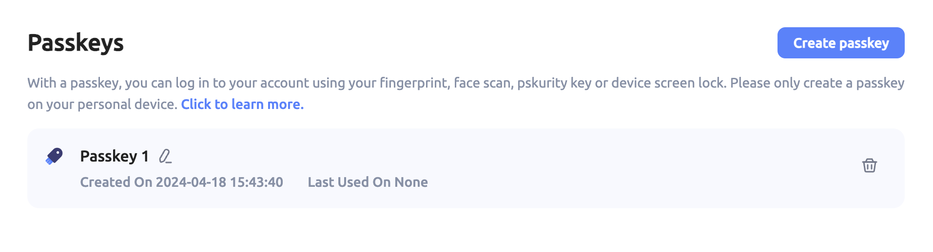 To add or remove a passkey, click View Details. Then, click Create Passkey to create a passkey. To delete a passkey, click