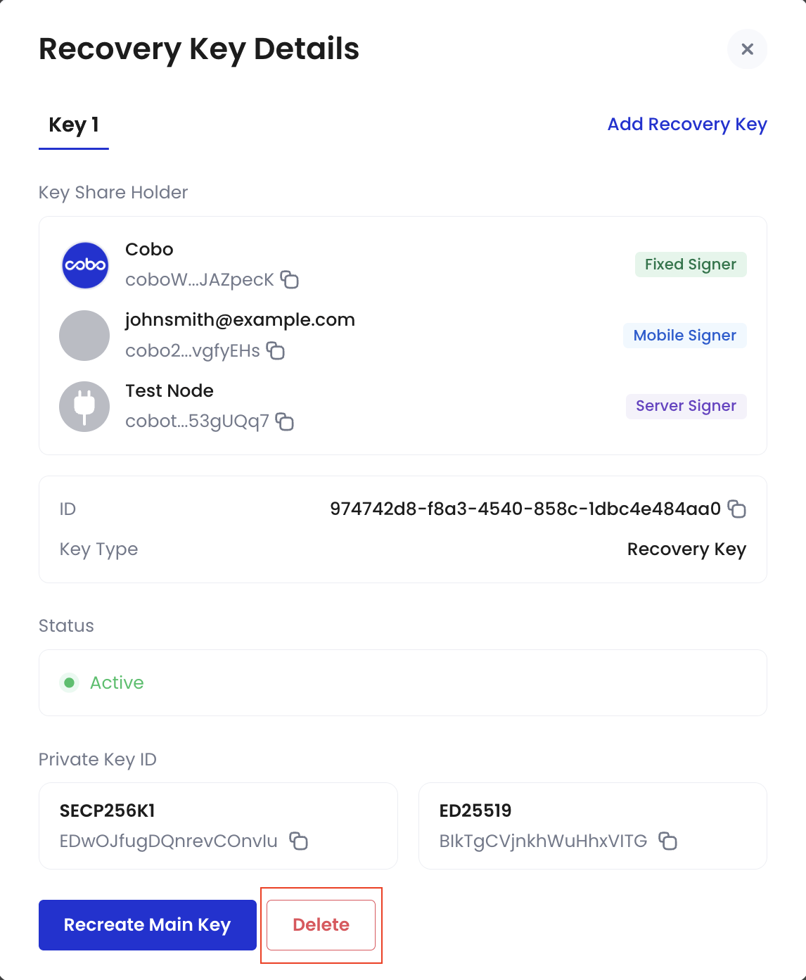 Recovery Keys serve two main purposes: Recover the whole private key and create a new Main Key if your Main Key and backup copy are lost or compromised. To learn more about backup and recovery, see Back up key shareas and Recover key shares. Similar to creating the Main Key and Signing Key, you have the option to choose either mobile signer or server signer when creating the Recovery Key. Make sure you understand the primary purposes and prerequisites of each signer type before proceeding further. After you’ve chosen a signer type and set up the prerequisites, follow the instructions below to create a Recovery Key.Only the users who have been assigned the Operator, Manager, Admin user roles in the organization can create a Recovery Key.