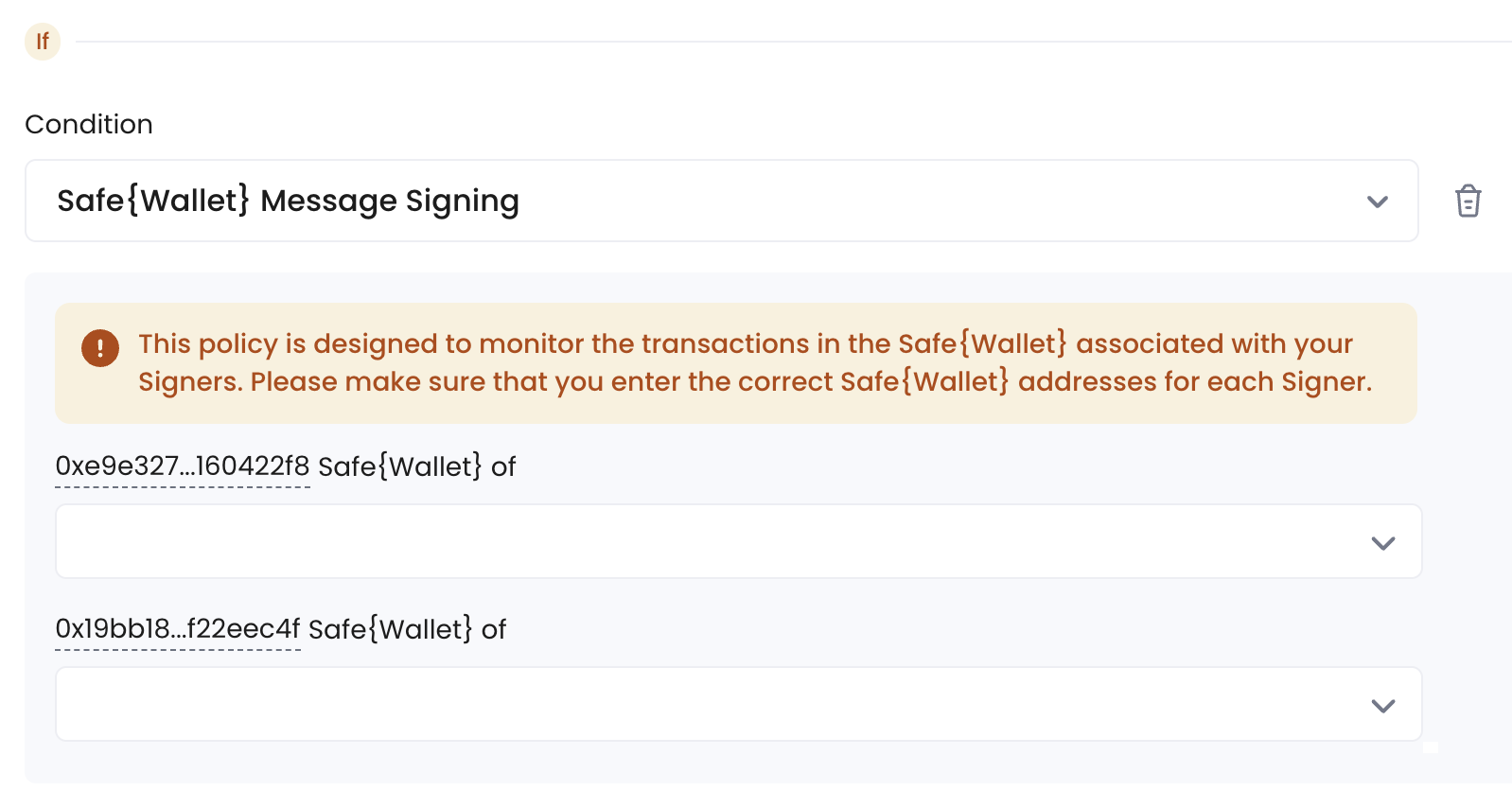 For security reasons, the condition Safe{Wallet} Message Signing cannot be combined with other conditions such as Initiators and Message Type in a policy. This ensures that your Safe{Wallet} message signing is protected by a dedicated policy.
